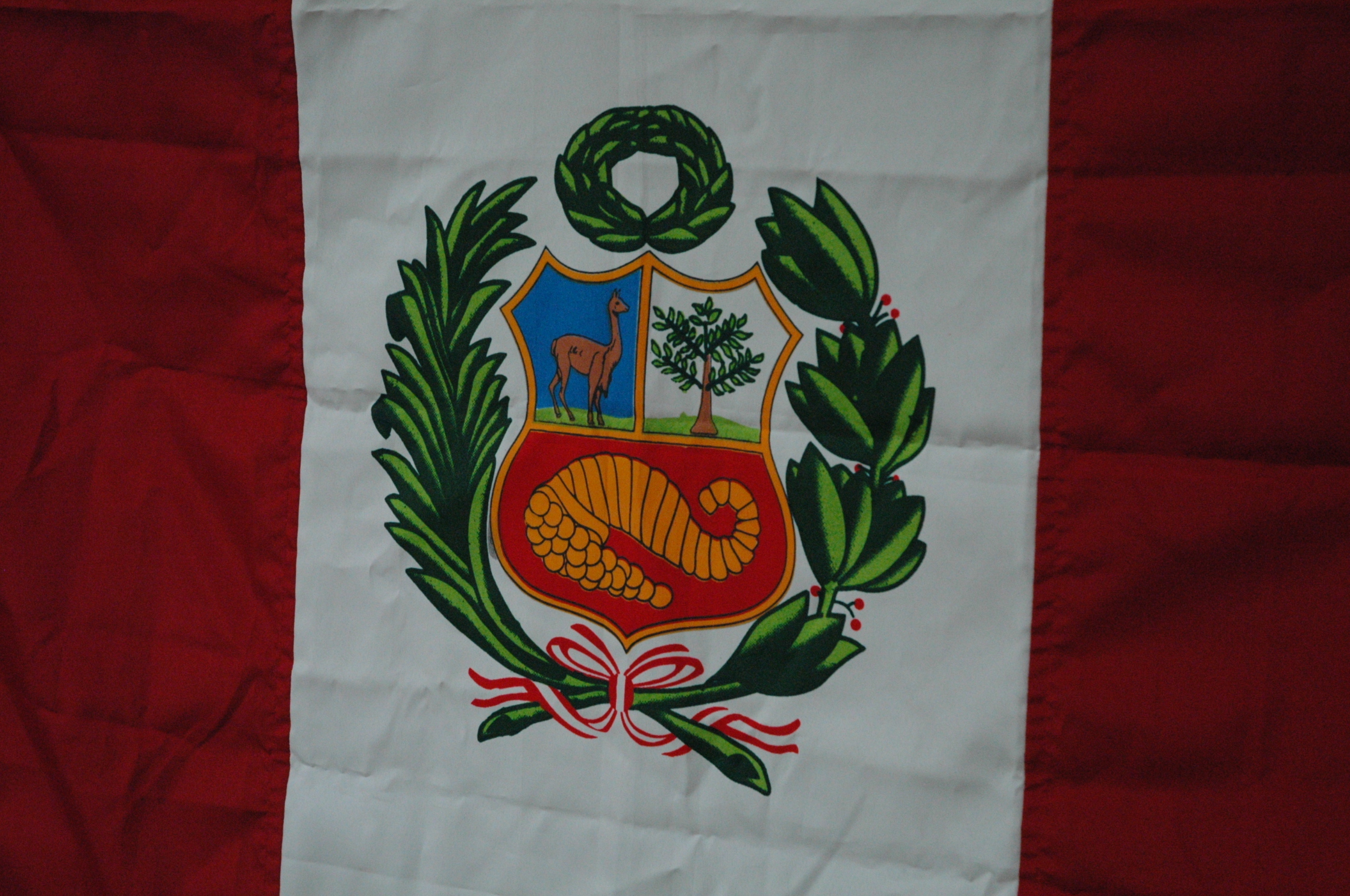 Télécharger la photo “L'enseigne nationale (pabellón nacional) Elle porte, sur la bande centrale, les armoiries du Pérou (escudo de armas).”