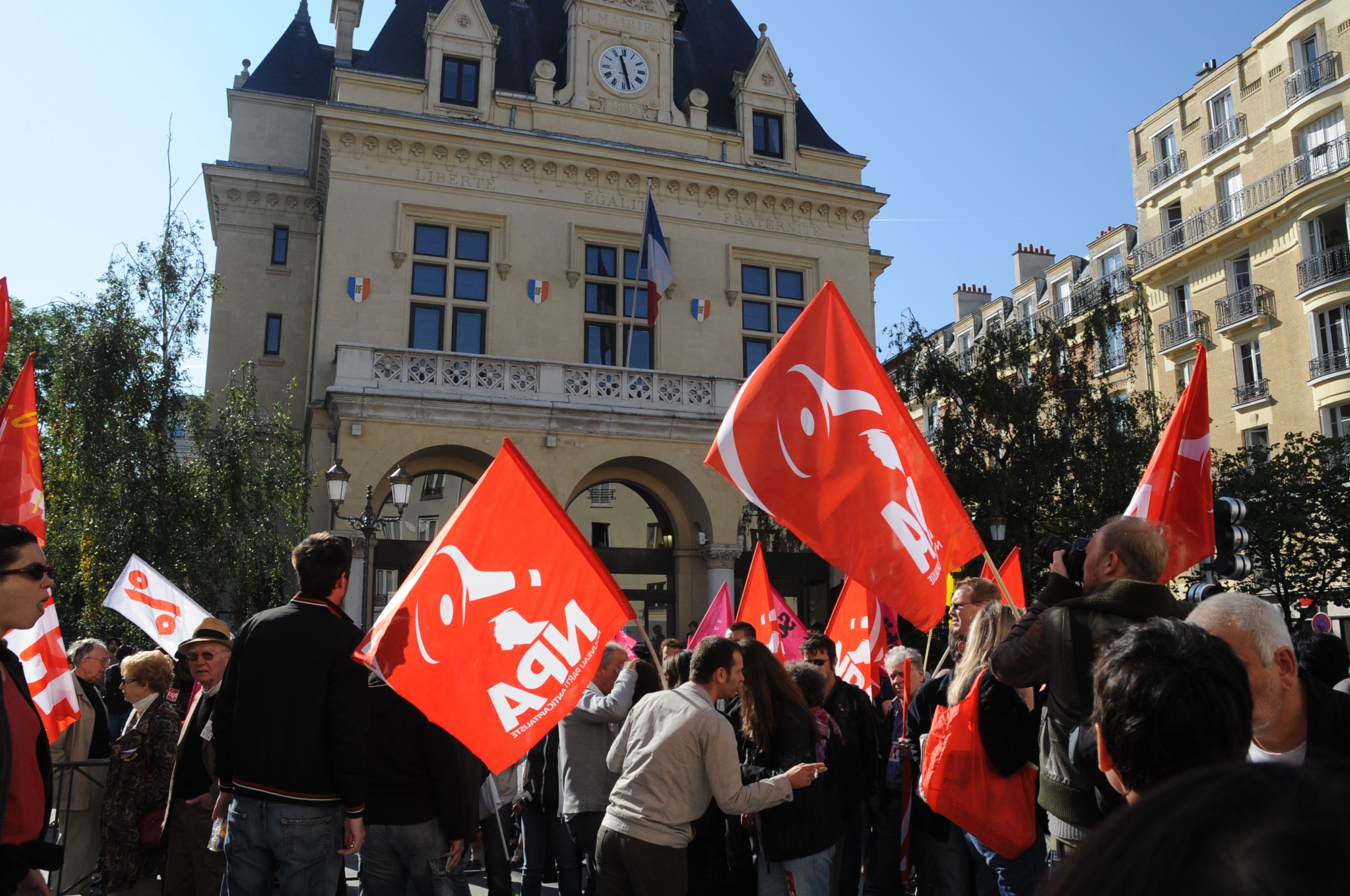 Télécharger la photo “Drapeaux du Npa devant la mairie des Lilas.”