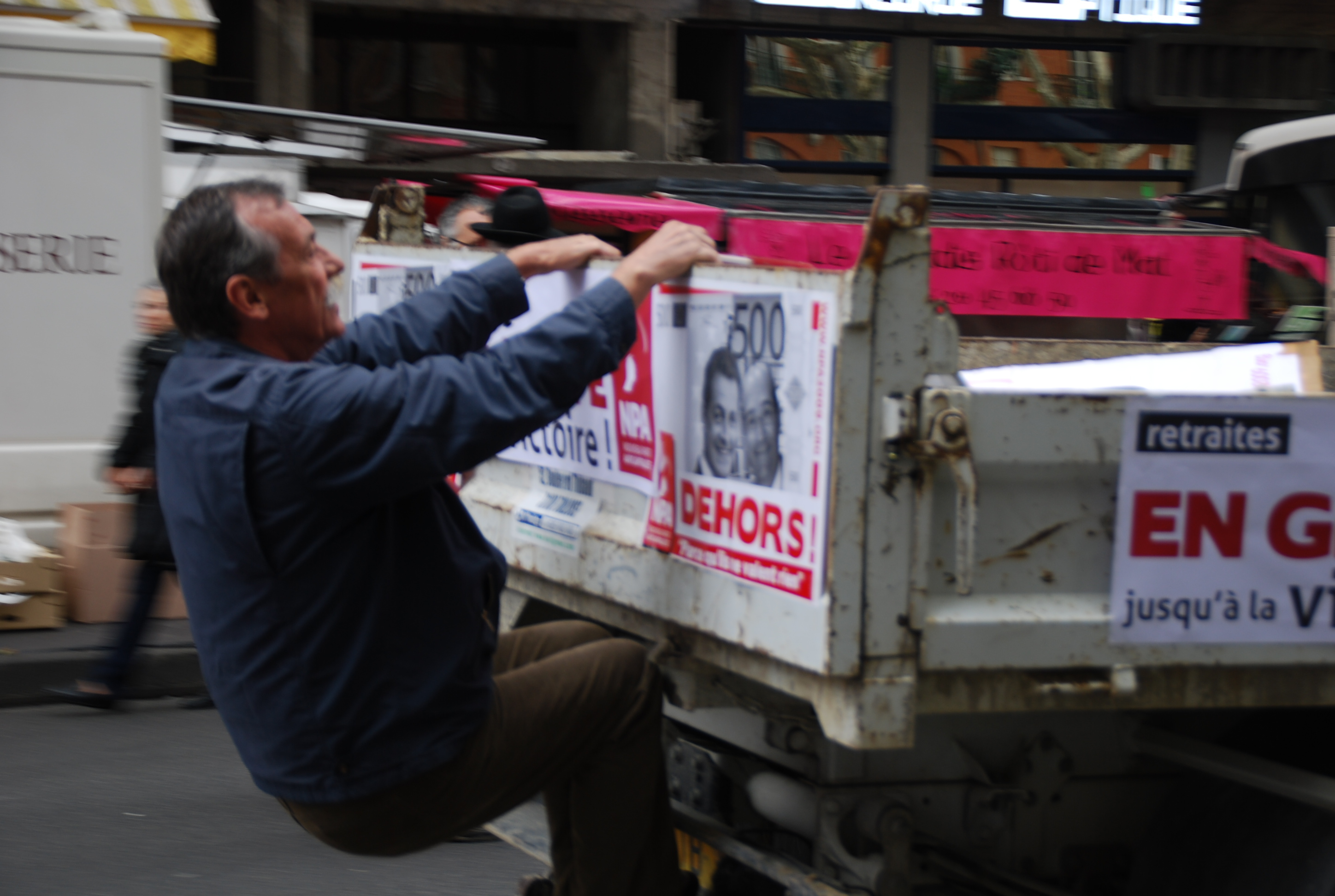 Télécharger la photo “Manifestant accroché au camion du NPA”