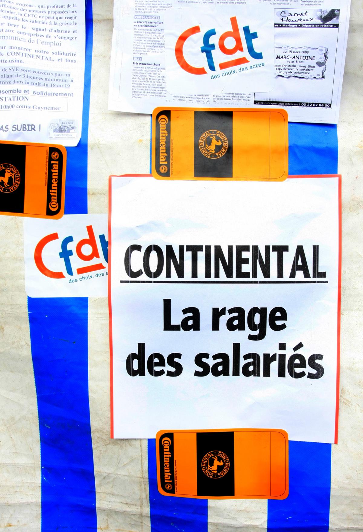 Le 17 mars 2009 les travailleurs de Continental à Clairoix (60) sont rassemblés devant l'entrée de l'usine. La veille ils ont manifesté à Reims à l'occasion du CCE dont ils ont empêché la tenue. La direction a annoncé la fermeture du site malgré l'engagement qu'elle avait pris du maintien de l'activité en échange de l'acceptation par les salariés en septembre 2007 du retour au 40h. CLAIROIX/2009/03/17/JMB