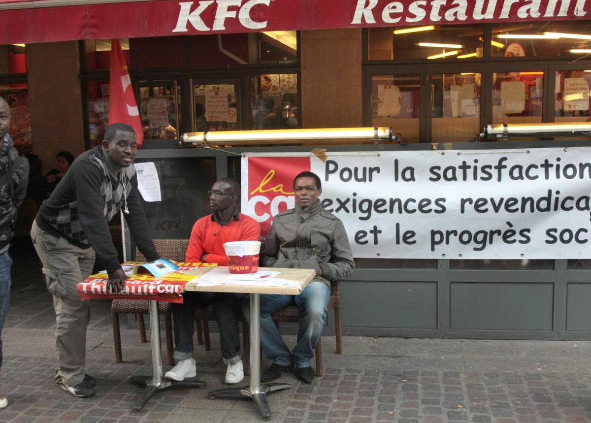 26 octobre 2009. Quartier des halles à Paris. Restaurant KFC. Des salariés sans-papiers en grève font signer la pétition de soutien devant le restaurant.