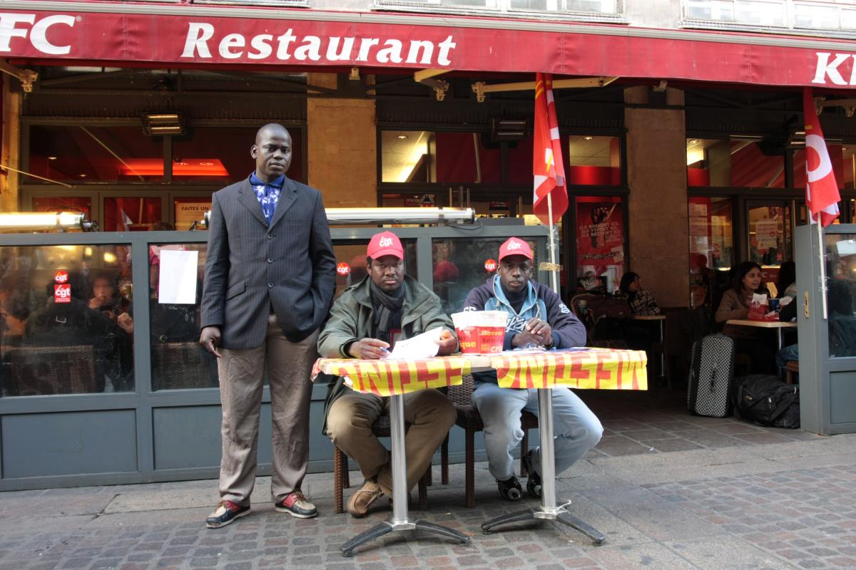 26 octobre 2009. Quartier des halles à Paris. Restaurant KFC. Des salariés sans-papiers en grève font signer la pétition de soutien devant le restaurant.