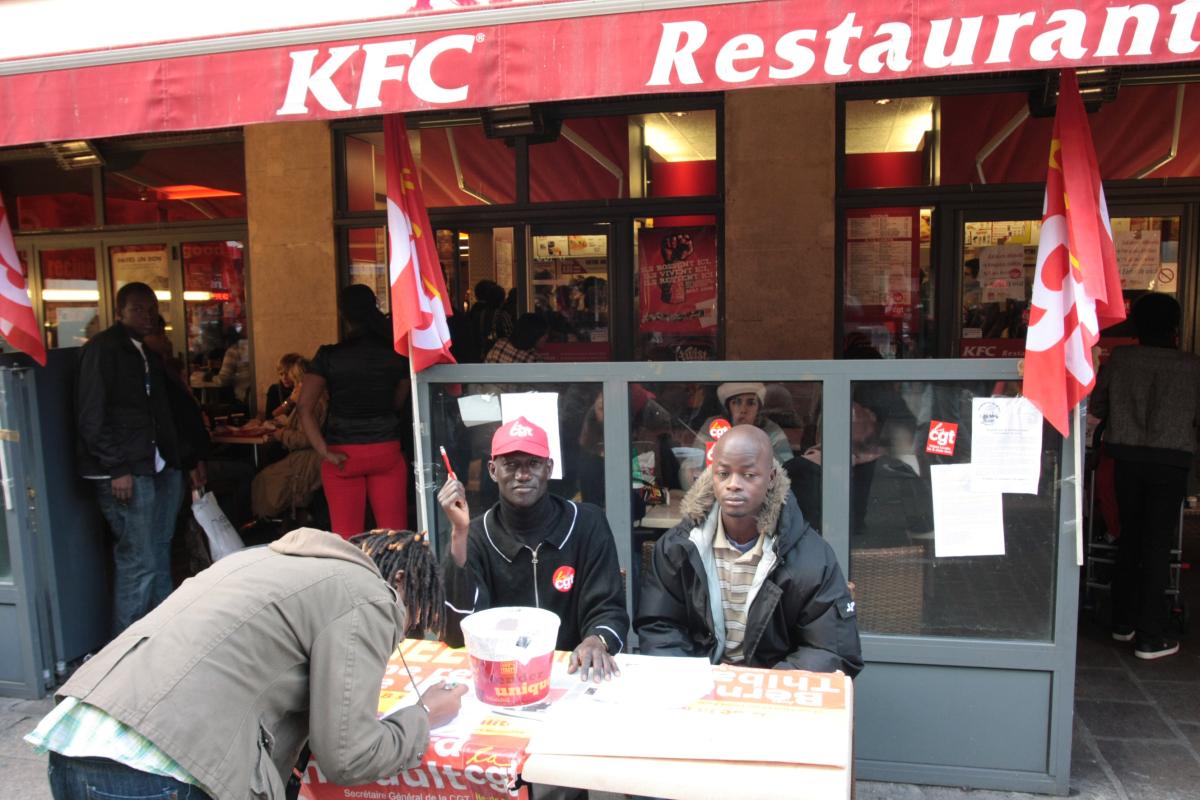 26 octobre 2009. Quartier des halles à Paris. Restaurant KFC. Des salariés sans-papiers en grève font signer la pétition de soutien devant le restaurant.