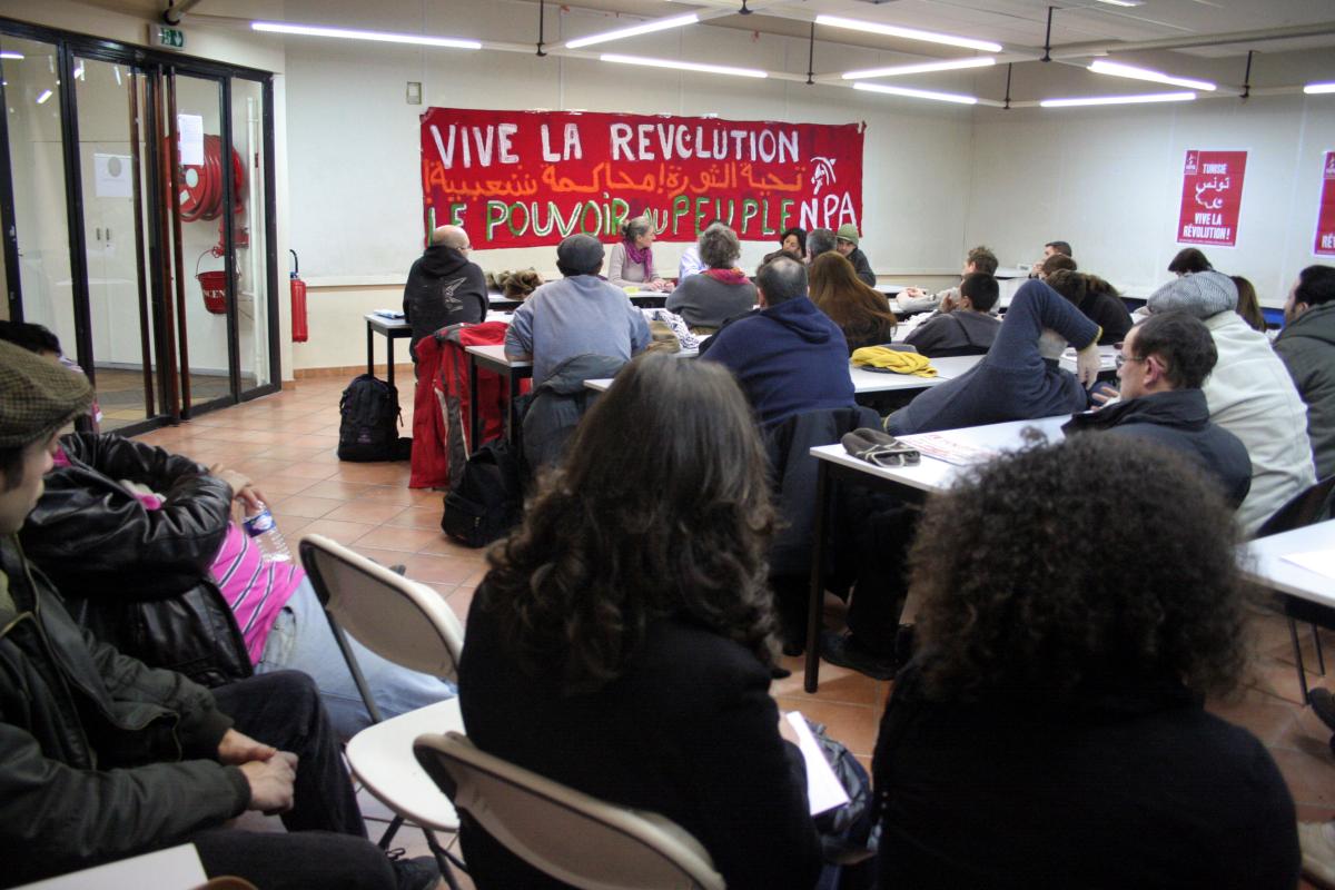 Le 1 février 2011 à Saint Denis, réunion débat sur la Tunisie, à l'initiative du NPA, avec Moudhaffar, engagé dans la lutte des mineurs de Gafsa de 2008 et emprisonné pour cela pendant un et demi, avec Wafa de la commission Maghreb du NPA et Adel Thabet porte parole du PCOT.