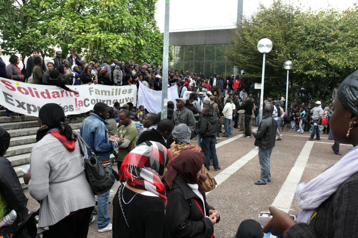 Rassemblement devant la préfecture de Bobigny le 12 octobre 2011 des mal-logés, expulsés de la Seine St Denis, pour exiger le relogement. Le préfet interdit les rassemblements sur le parvis de la préfecture et cantonne les manifestants dans un coin de la place.