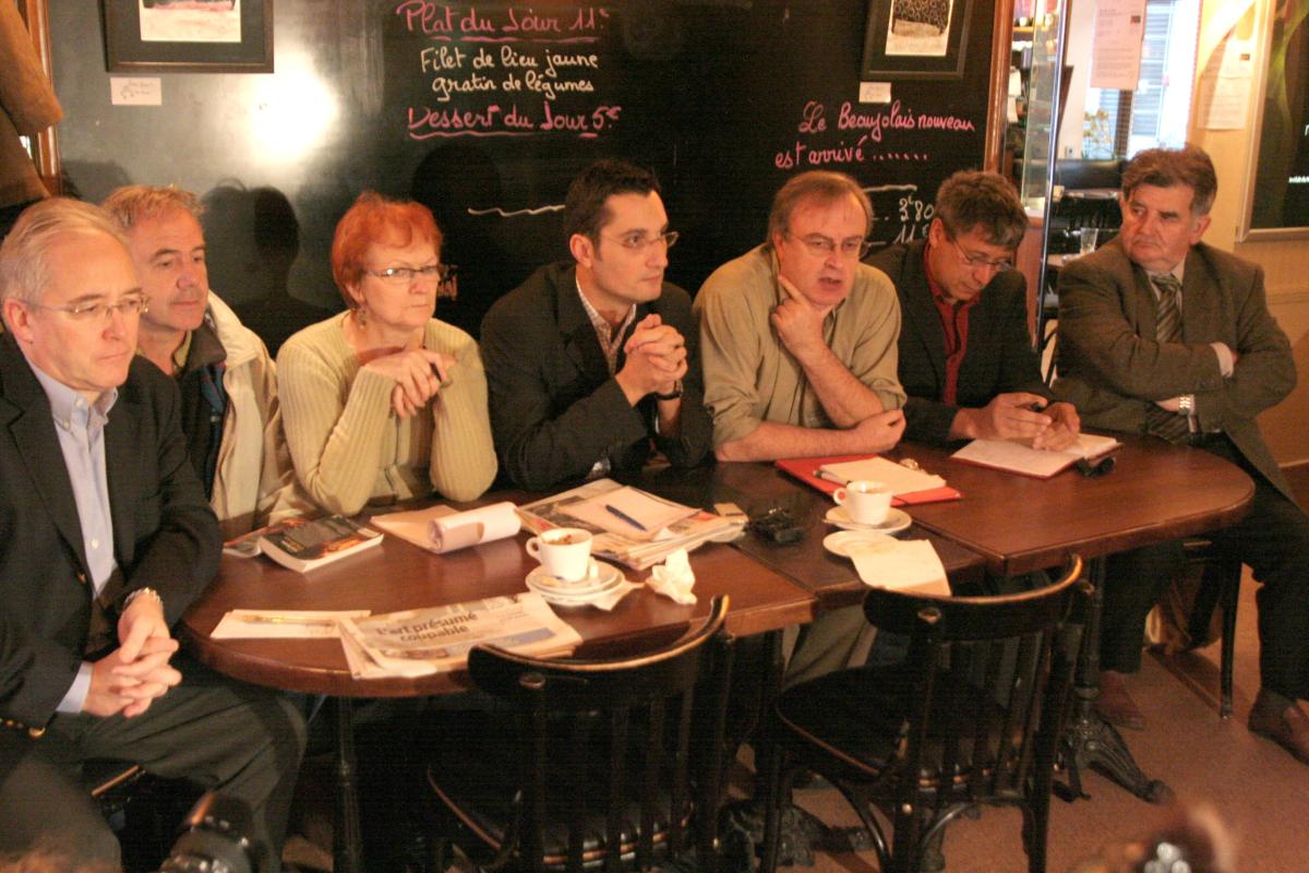 Conférence de presse des porte-parole du collectif national pour une candidature antilibérale à la présidentielle de 2007, au café Le Croissant (où fut asassiné Jean JAURES), à Paris, rue de Montmartre, lundi 20 novembre 2007. Etaient présents: Christian PICQUET (LCR), Jean-Jacques BOISLAROUSSIE (Alternatifs, Claire VILLIERS (Alternative citoyenne), Olivier DARTIGOLLES (PCF), Claude DEBONS (syndicaliste), Eric COQUEREL (Mars), Pierre CARASSUS (Gauche républicaine). Paris/JMB/20/11/2006. Publiée dans Rouge n°2183.
