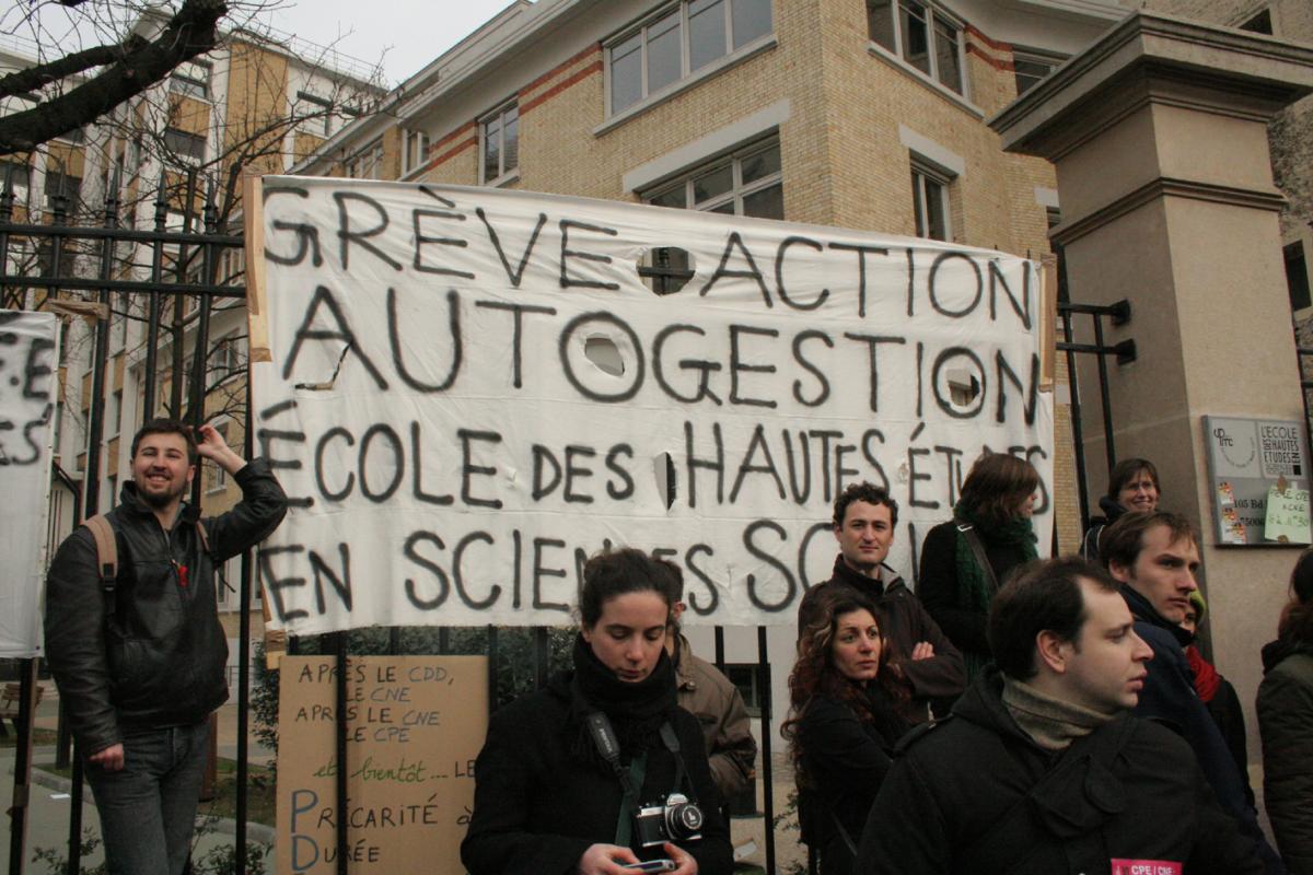 Manifestation parisienne contre le contrat première embauche (CPE, instaurant une période d'essai de deux ans pour le premier emploi) voulu par le Premier ministre Dominique de Villepin. Défilé de place d'Italie à Invalides, fin de manif marquée par d'importantes violences à Invalides. Avant tout des étudiants, mais cette manifestation, un jeudi, marque l'entrée en force des lycéens. 500000 personnes dans toute la France. Banderole de l'Ecole des hautes études en sciences sociales, occupée pendant une bonne partie du mouvement. Paris/16/03/2006/@Sven_A.