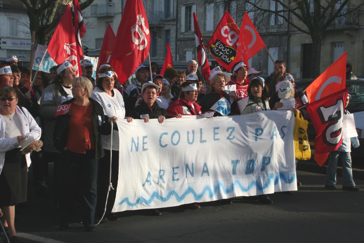 La manifestation de soutien aux salariées d'Arena à Libourne le 14 janvier 2006 qui a rassemblé près de 500 personnes. Le deuxième leader mondial du maillot de bain a annoncé la fermeture de son usine de production de Libourne, la seule restante en Europe, pour délocaliser en Chine. 169 salariés seront jetés à la rue, avant le 30 mars 2007. La lutte s'organise pour le maintien de l'emploi, avec l'intersyndicale Arena (CGT-CFDT et FO) et le comité de soutien constitué des organisations locales, syndicales, politiques et associatives. Libourne/2007/01/14/Meno