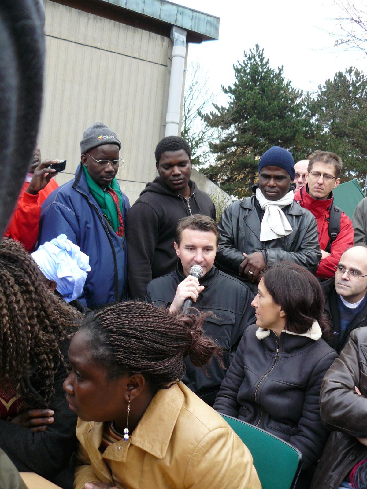Olivier Besancenot prenant la parole à la conférence de presse pour les sans-papiers de Saint-Paul à Nanterre.