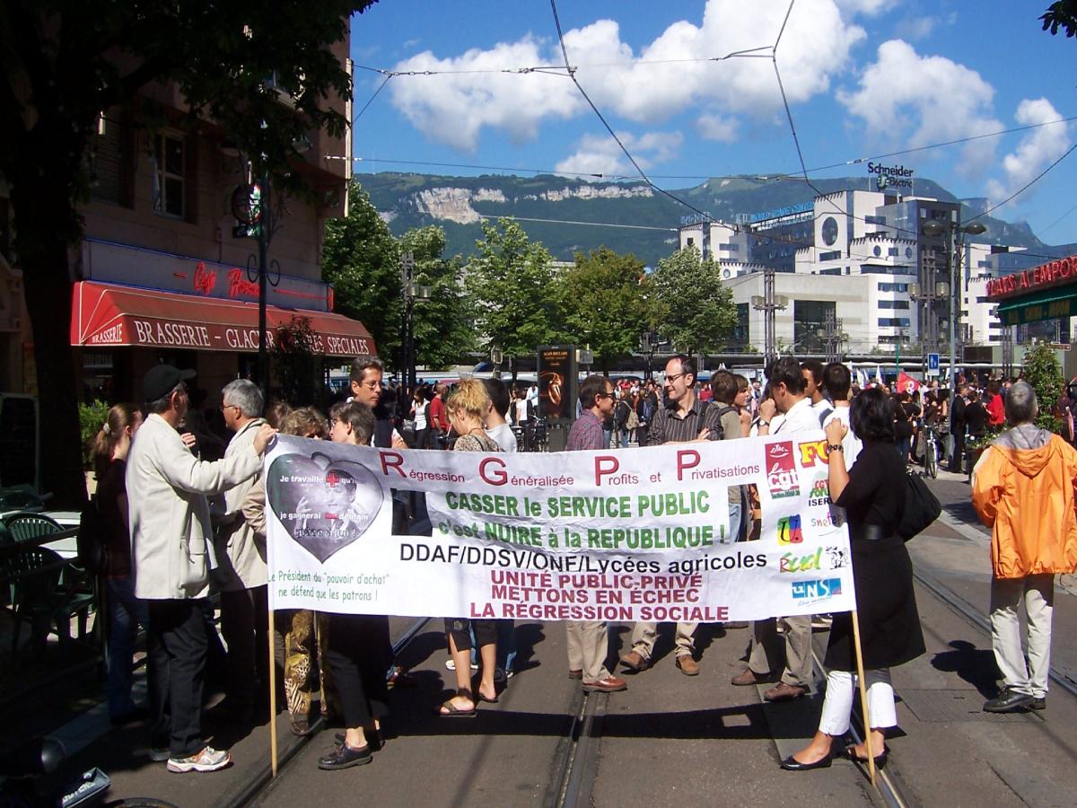 Grenoble manif fonction publique du 10 juin 2008. Très, très faible mobilisation : 800 personnes. Le 15 mai, nous étions plus de 10 000. Quasi absence des cortèges CGT.