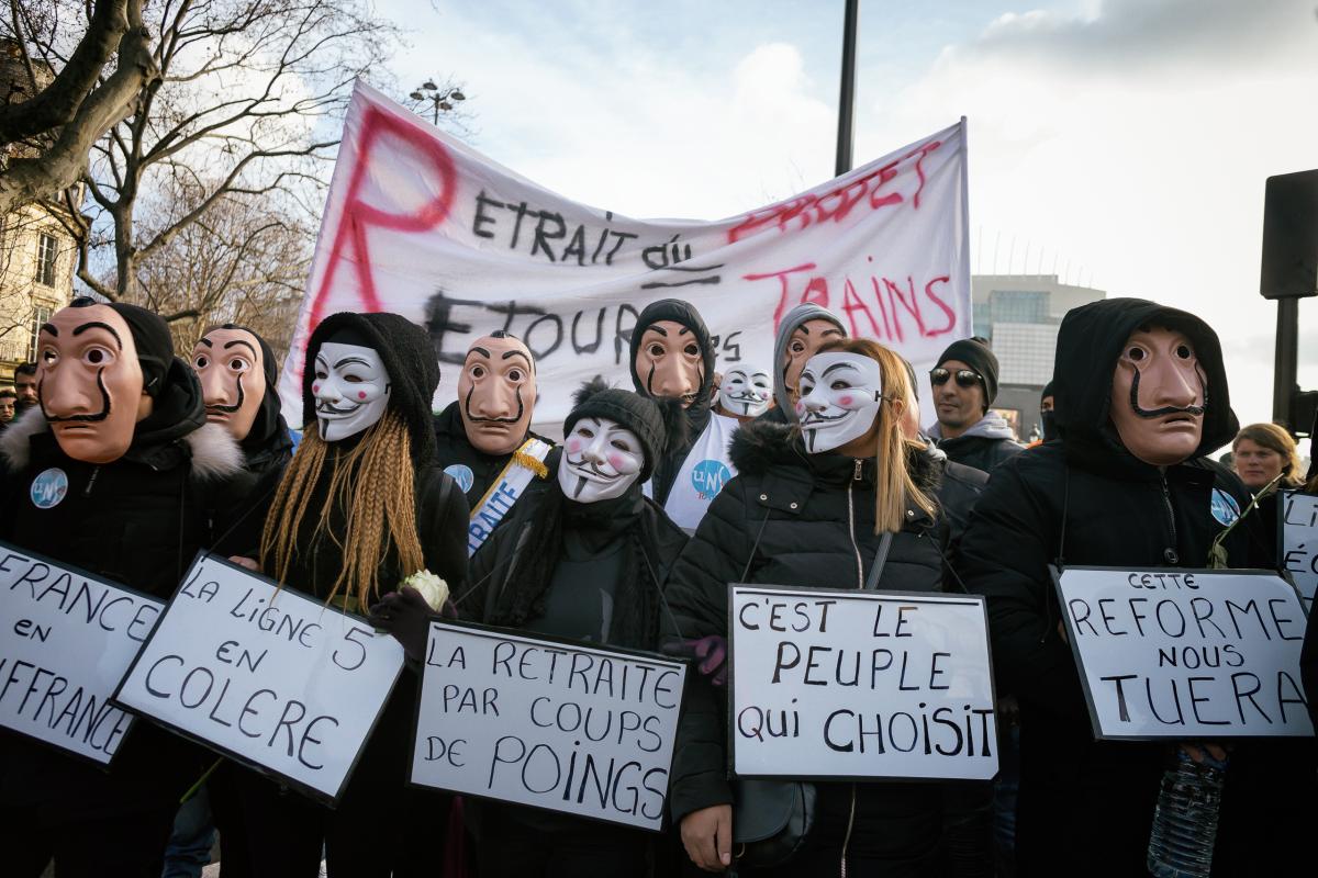 Workers of line 5 of the Paris metro disguised as anonymous and la casa de papel, demonstration against pension reform, Paris, January 4 2020.