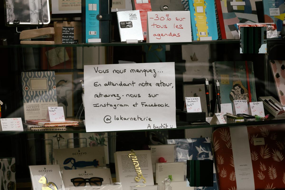 La vitrine d'une papeterie fermee avec un mot pour leur clients, Bayonne, 11 avril 2020.