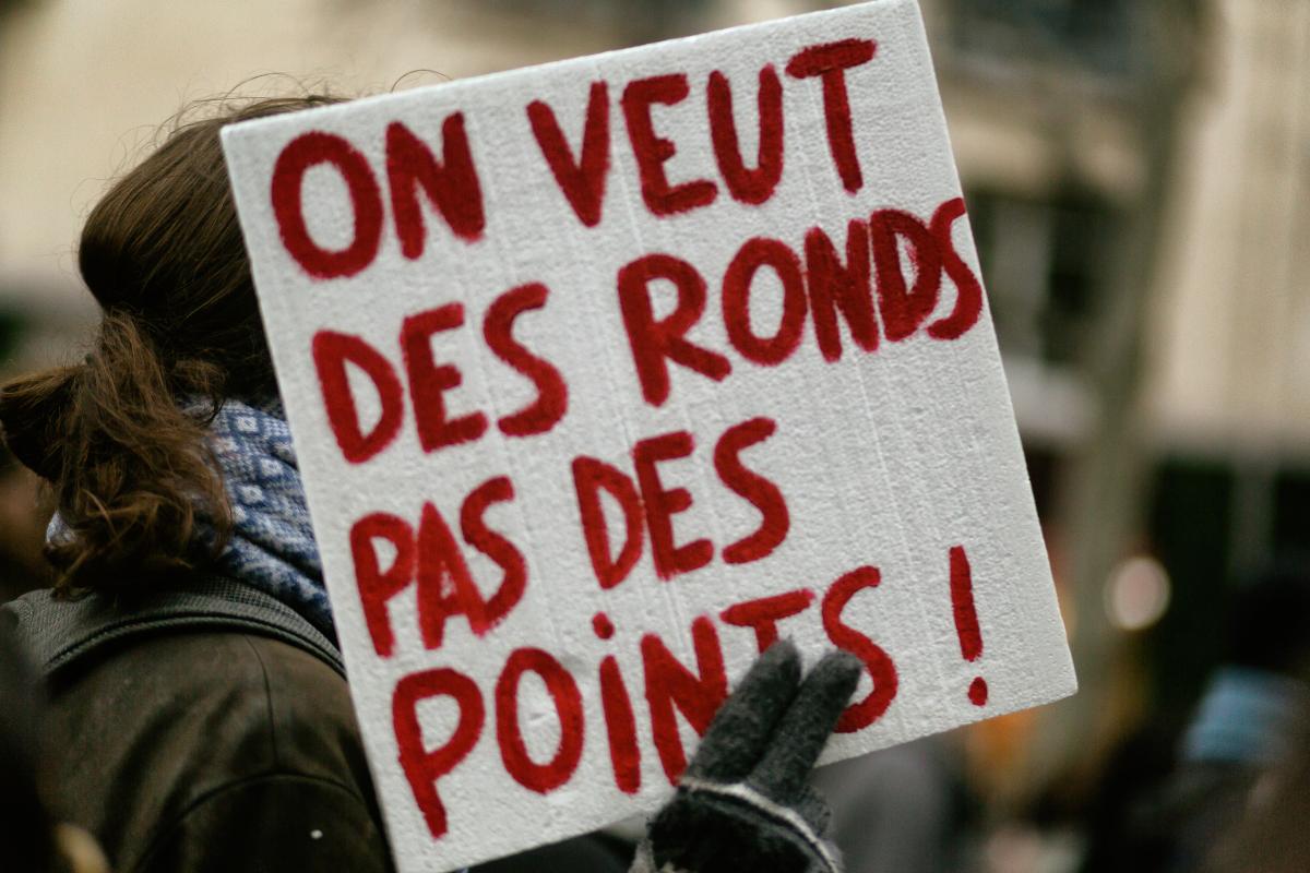 A protester with sign against pensions by points, demonstration against pension reform, Paris, January 14 2020.