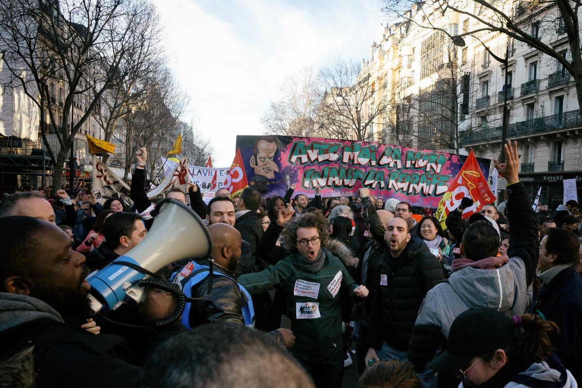 Des travailleurs de la RATP chantent et dansent, manifestation contre la reforme des retraites, Paris, 16 janvier 2020.