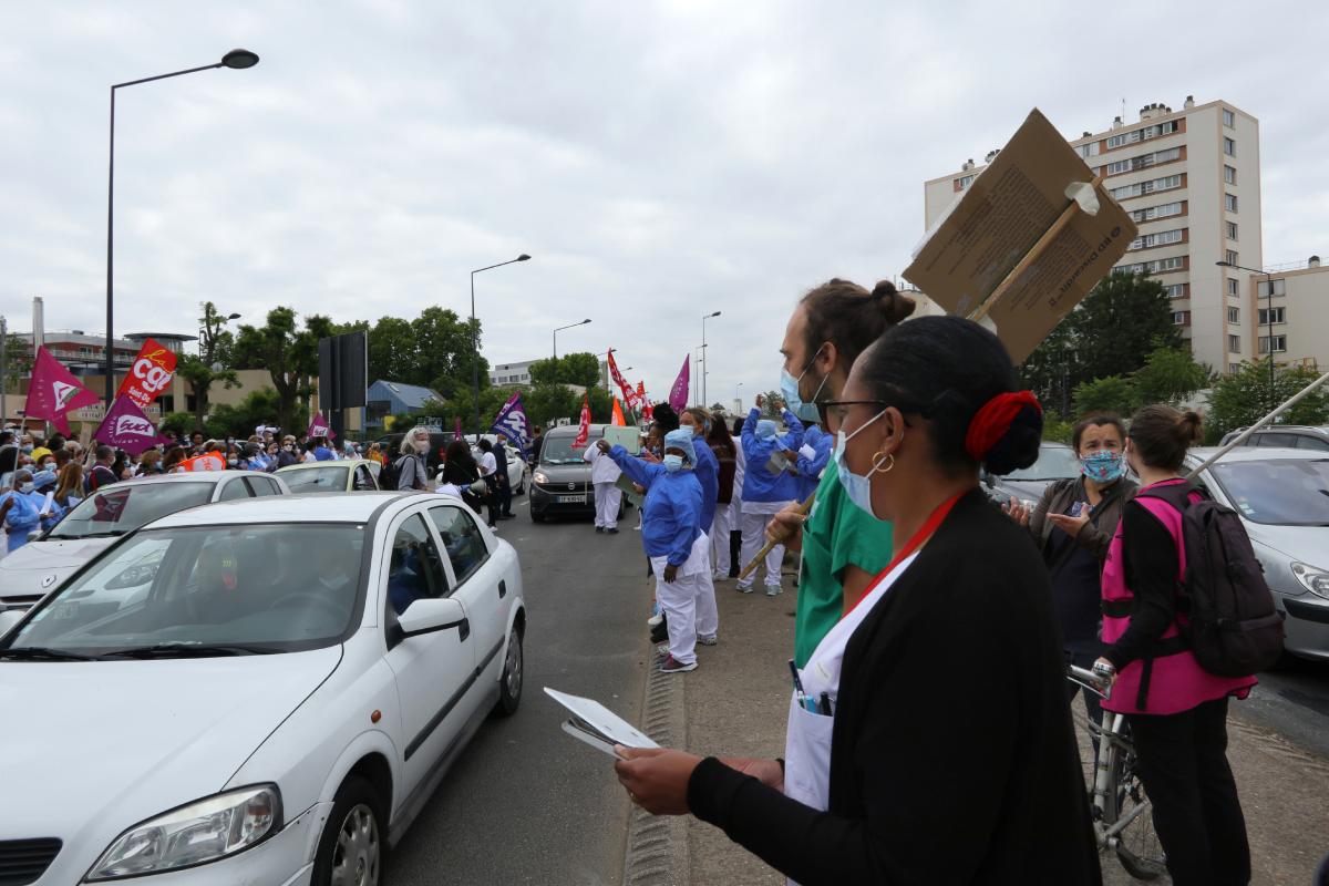 Saint-Denis, le jeudi 9 juin 2020, le personnel de l'hôpital Delafontaine sort manifester pour ses revendiquations et bloque partiellement la bretelle de l'autoroute.