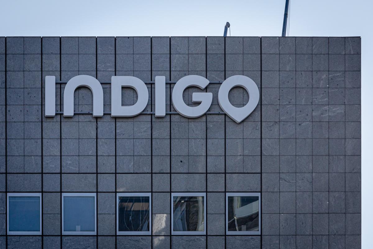 Logo of Indigo, on the front of their headquarters in La Dafense, Nanterre, November 05 2020. Photograph by Martin Noda / Hans Lucas.