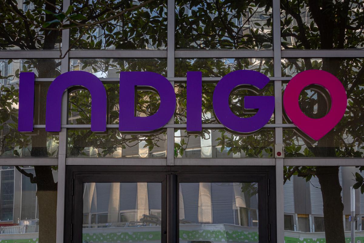 Logo of Indigo, on the front of their headquarters in La Dafense, Nanterre, November 05 2020. Photograph by Martin Noda / Hans Lucas.