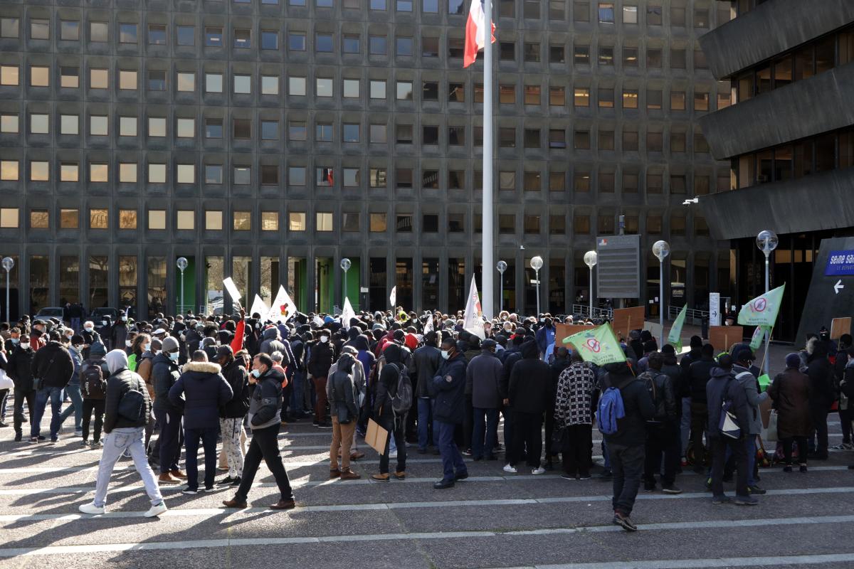 Bobigny, le 7 avril 2021, plusieurs collectifs de sans-papiers se rassemblent sur le parvis de la préfecture de la Seine-saint-Denis pour exiger leur régularisation. Ils protestent contre l'impossibilité d'obtenir des rendez-vous depuis la généralisation des démarches par internet.