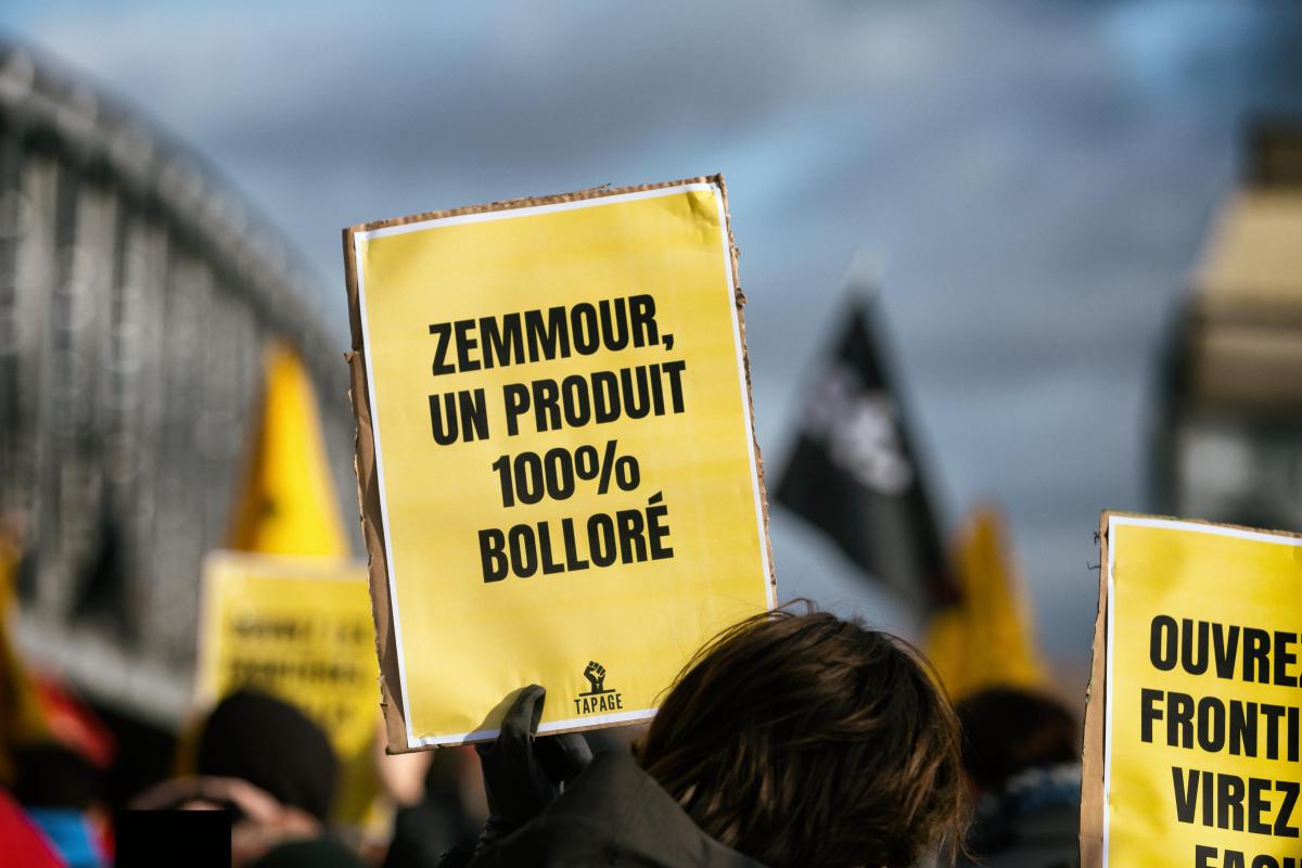 France, Paris, 2021-12-05. Une pancarte avec le slogan "Zemmour, un produit 100% Bollore". Manifestation contre le meeting d Eric Zemmour a Paris. Photographie de Martin Noda / Hans Lucas