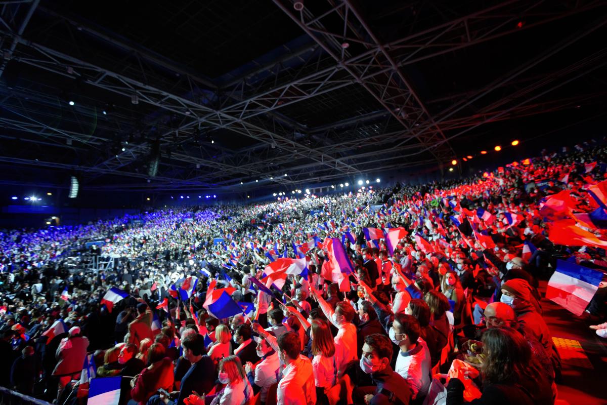 France, Paris, 2022-002-13. Salle comble et beaucoup de drapeaux tricolores. Meeting de Valerie Pecresse au Zenith de Paris. Photographie de Martin Noda / Hans Lucas