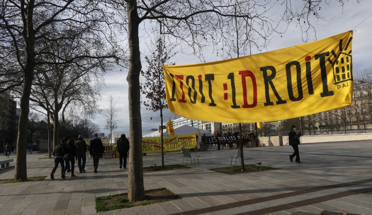 Dimanche 13 mars 2022, place de la Bastille à Paris, Campement organisé par le DAL pour les oublié.es du DALO. Philippe Poutou vient les soutenir.