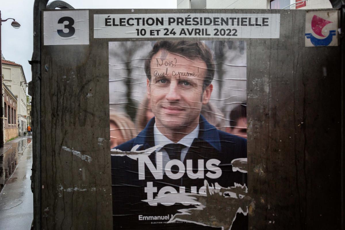 France, Paris, 2022-04-01. Affiche d Emmanuel Macron legerement dechiree avec un tag sur son front "Nous quel cynisme". Affiches electoraux sur les panneaux officiels. Photographie de Martin Noda / Hans Lucas.
