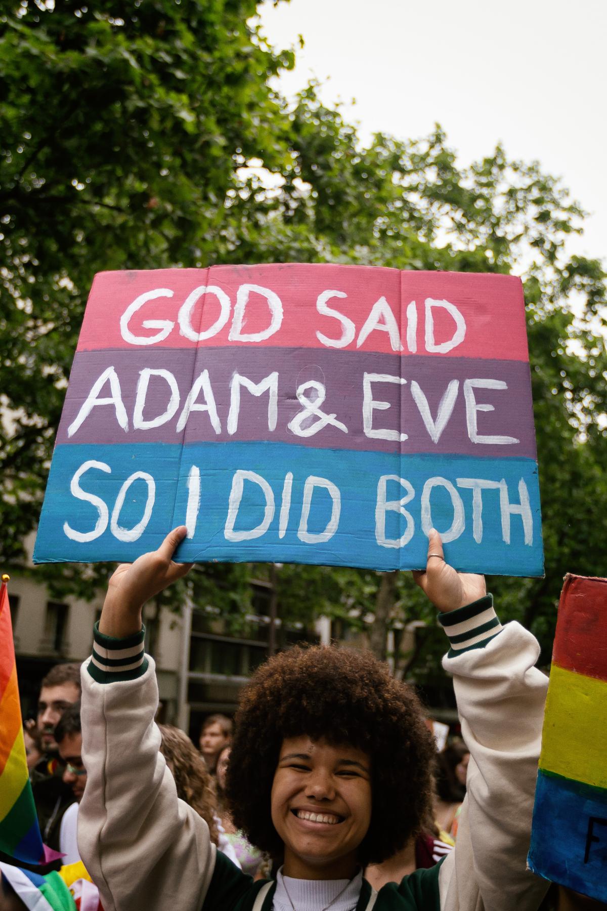 France, Paris, 2022-06-25. A demonstrator with a sign with the slogan "God said Adam and Eve, so i did both". Gay Pride. Photograph by Martin Noda / Hans Lucas