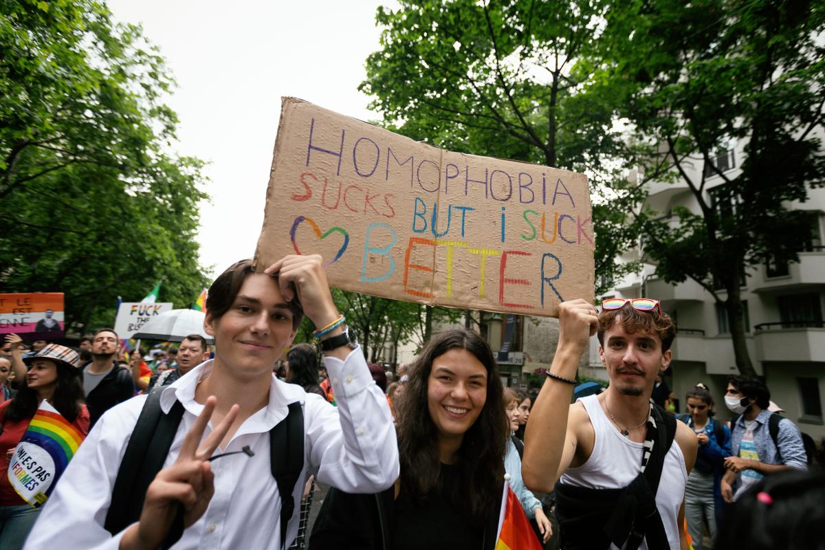 France, Paris, 2022-06-25. Des manifestants avec une pancarte avec le slogan "L homophobie, ça craint mais je suce mieux". Marche des fiertes. Photographie de Martin Noda / Hans Lucas