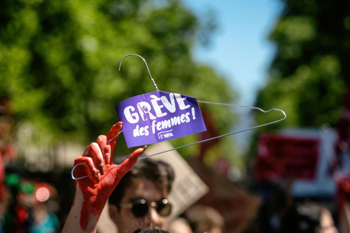 France, Paris, 2022-07-02. Une manifestante avec un cintre avec un autocollant du NPA avec le slogan "greve des femmes" et de la peinture rouge a la main pour imiter le sang. Manifestation pour le droit a l avortement. Photographie de Martin Noda / Hans Lucas