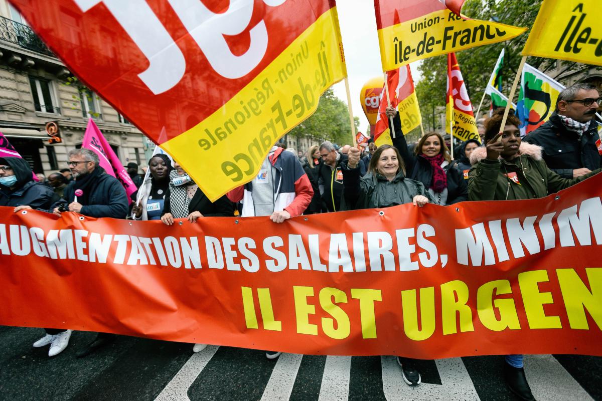 France, Paris, 2022-09-29. Banderole de tete. Manifestation intersyndicale pour l augmentation des salaires. Photographie de Martin Noda / Hans Lucas