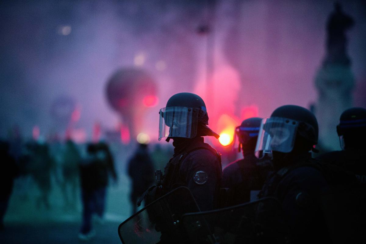 France, Paris, 2023-01-31. Police officers in front of a Sud Rail balloon and among smoke bombs and tear gas. Demonstration against pension reform. Photograph by Martin Noda / Hans Lucas