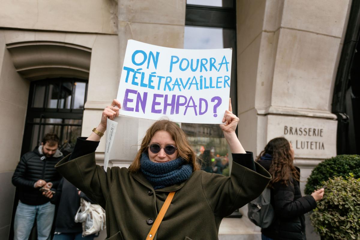 France, Paris, 2023-03-07. A demonstrator with a sign with the slogan "It will be possible to telework in nursing homes". Sixth demonstration against pension reform. Photograph by Martin Noda / Hans Lucas