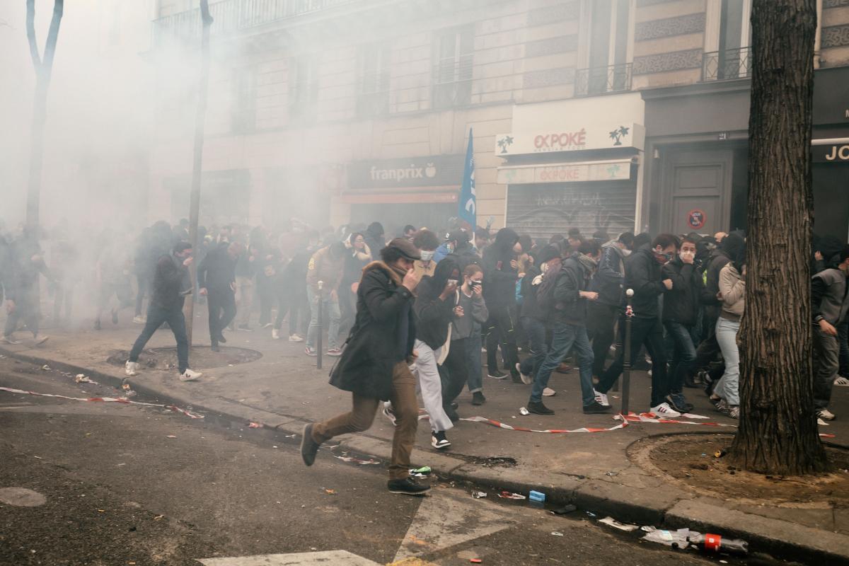 France, Paris, 2023-03-23. The crowd tries to escape from the clouds of tear gas 9th inter-union demonstration against pension reform. Photograph by Martin Noda / Hans Lucas