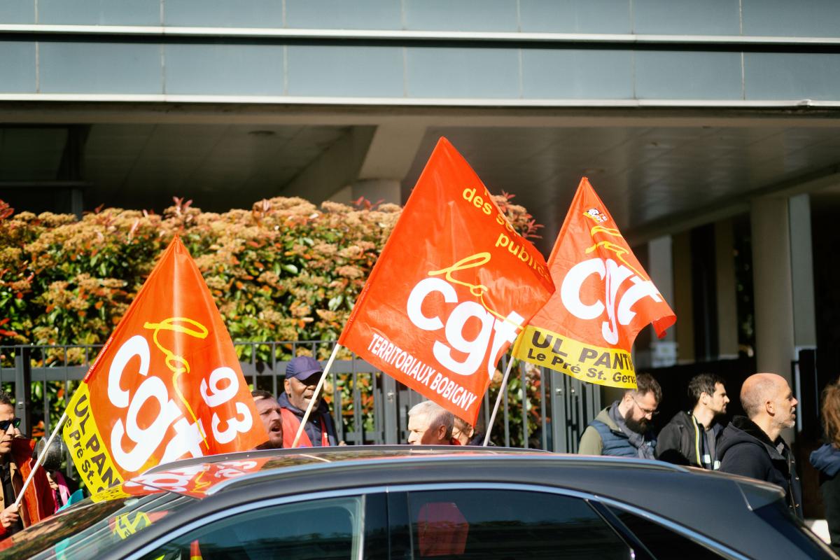France, Paris, 2023-04-19. Rally against the arrival of the Minister for Vocational Education, Carole Grandjean, in front of the Hermes workshops in Pantin. Photograph by Martin Noda / Hans Lucas