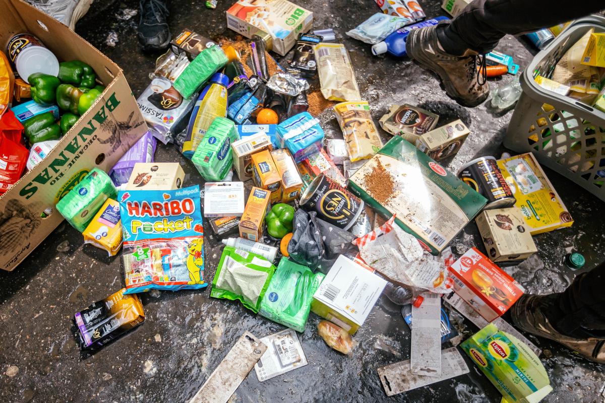 France, Paris, 2023-05-1. Foodstuffs from a looted Carrefour are laid on the ground for the demonstrators to pick up. May day demonstration against pension reform. Photograph by Martin Noda / Hans Lucas