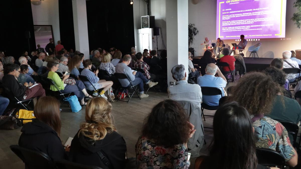 Paris le 2 juillet 2023, à la Bellevilloise, Forum anticapitaliste avec des représentantEs d'Ensemble, du NPA, de Rejoignons-nous, et des militantEs signataires de l'appel.