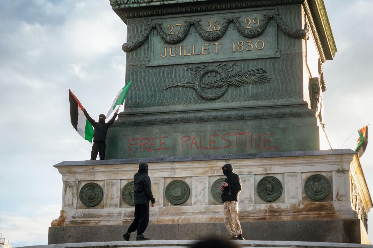 France, Paris, 2023-11-04. A tag with the slogan "Free Palestine" written on the July column at Bastille. Demonstration in support of palestinian poeple. Photograph by Martin Noda / Hans Lucas