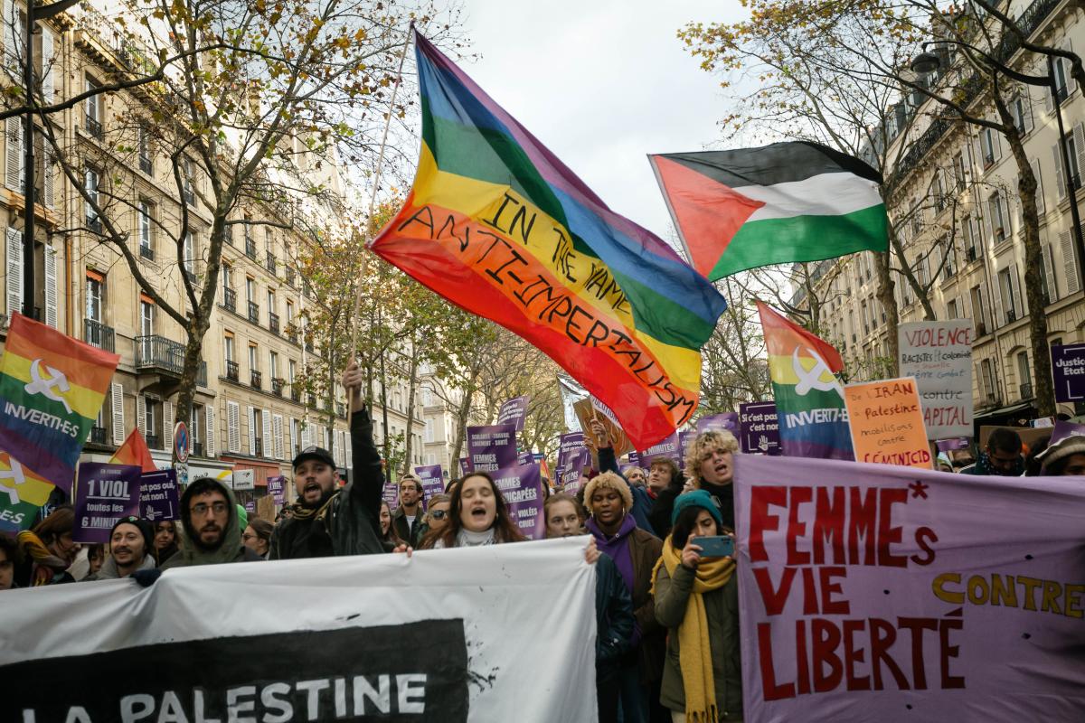 France, Paris, 2023-11-25. Cortege LGBTI. des drapeaux de l asociation les inverti e s, un drapeau palestinien et un manifestant avec un drapeau arc en ciel avec le slogan "in the name of anti imperialism" Manifestation contre les violences sexuelles et sexistes. Photographie de Martin Noda / Hans Lucas