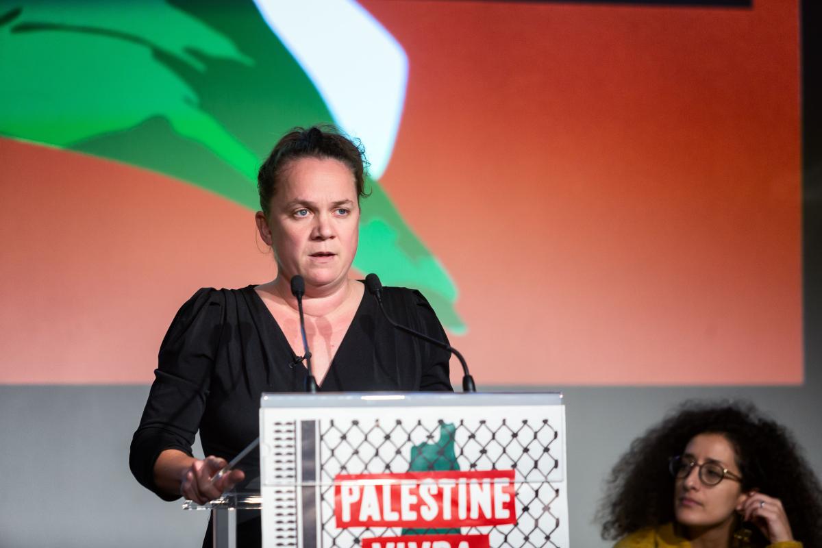 France, Paris, 2023-12-05. Pauline Salingue spokewoman of NPA take the floor. NPA Meeting at La Bellevilloise in support of Palestine. Photograph by Martin Noda / Hans Lucas