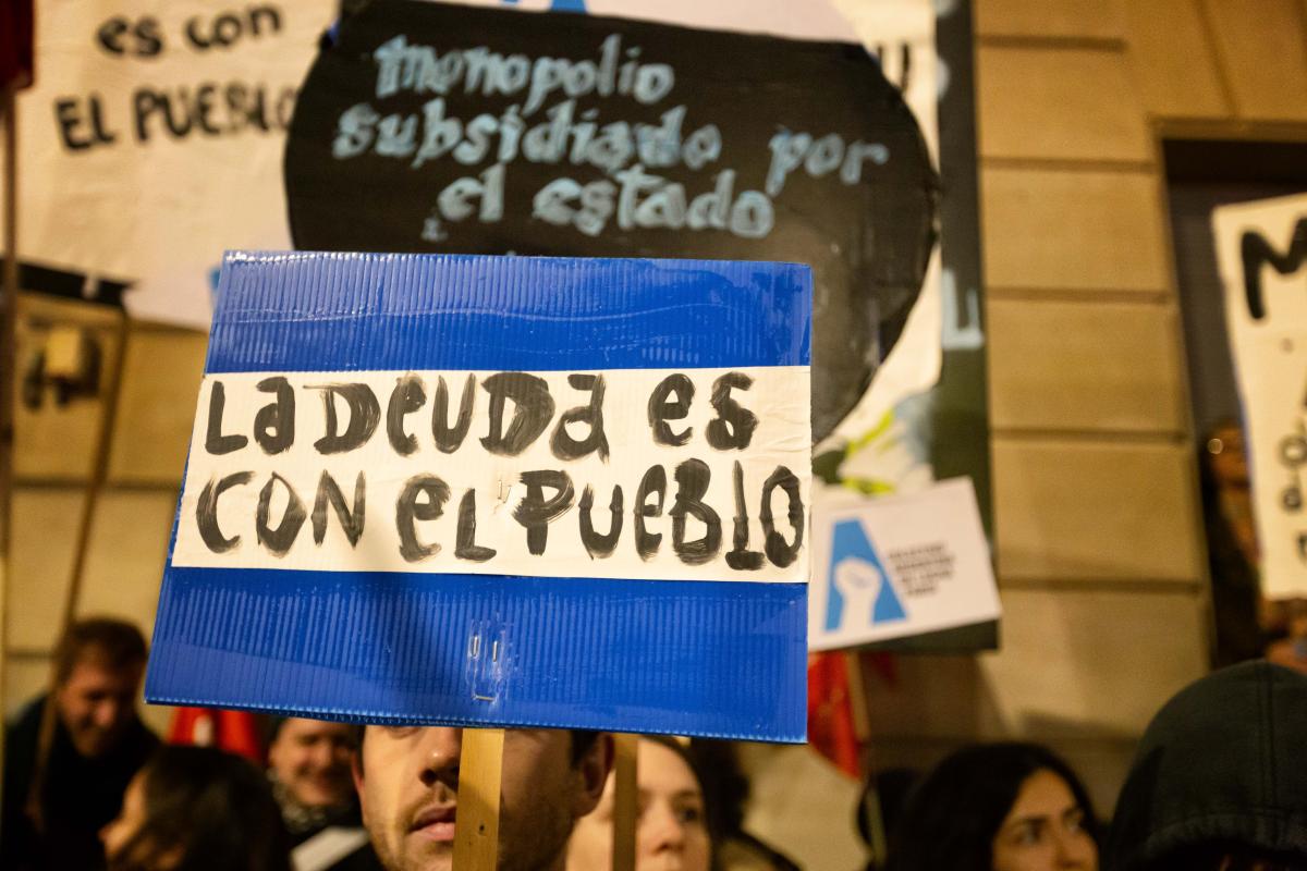 France, Paris, 2024-01-24. Une pancarte avec le slogan "La deuda es con el pueblo" (La dette est due au peuple). Rassemblement a proximite de l ambassade argentine en soutien de la greve general en Argentine. Photographie de Martin Noda / Hans Lucas