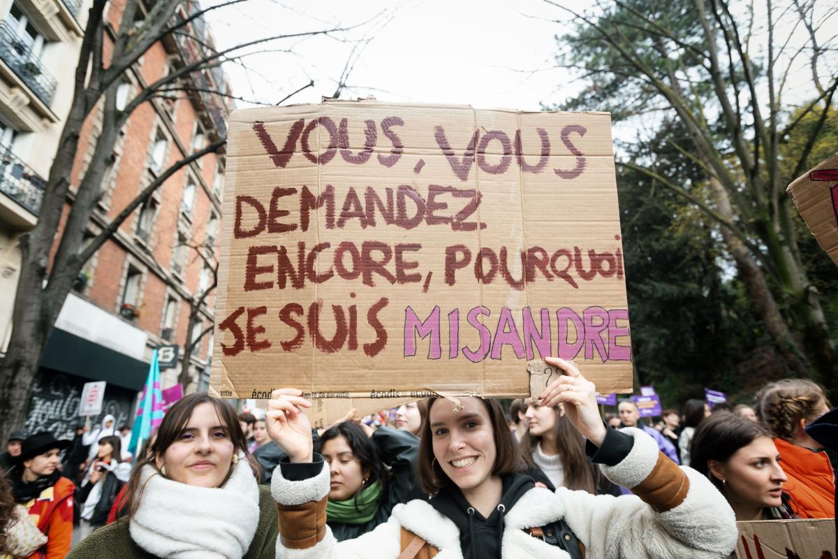France, Paris, 2024-03-08. Two demonstrators with a placard with the slogan "You re still wondering why I m a misandrist". Demonstration for womens rights. Photograph by Martin Noda / Hans Lucas