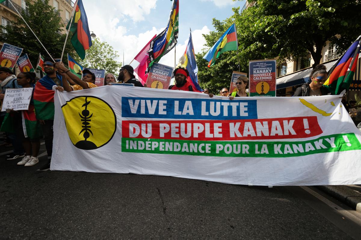 France, Paris, 2024-05-25. A banner with the slogan "Long live the struggle of the Kanak people, independence for Kanaky". Demonstration in support of the Kanaky - New Caledonia revolt. Photograph by Martin Noda / Hans Lucas