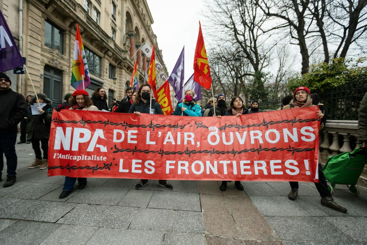 France, Paris, 2025-02-15. Cortege du Npa l Anticapitaliste avec une baderole sur laquelle on peut lire "De l air, ouvrons les frontieres". Manifestation en soutien des mineurs isoles qui occupent la Gaite Lyrique. Photographie de Martin Noda / Hans Lucas