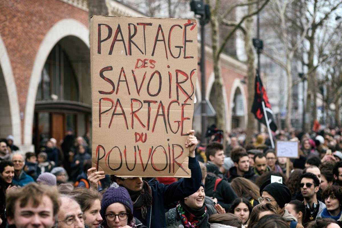 Pancarte Partage des savoirs, partage du pouvoir dans le cortège étudiant