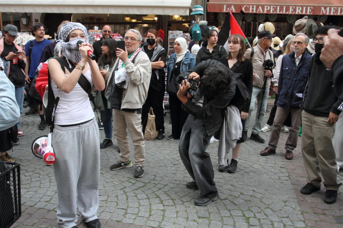 France,Strasbourg, 17-05-2025:le cortège a finalement l'accès à la place de la Cathédrale, comme convenu à l'origine, sauf les manifestantEs ne peuvent faire la chaine humaine comme prévu.Prise de parole d'un lycéenne .