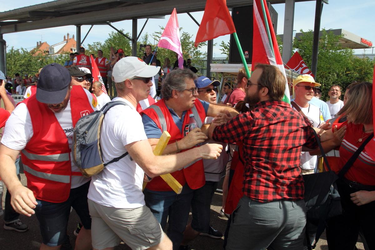 France, Mertzwiller, 05-07-2025: des membres de FO expulsent des militantEs de la gauche radicale après qu'ils aient crié des slogans contre le RN