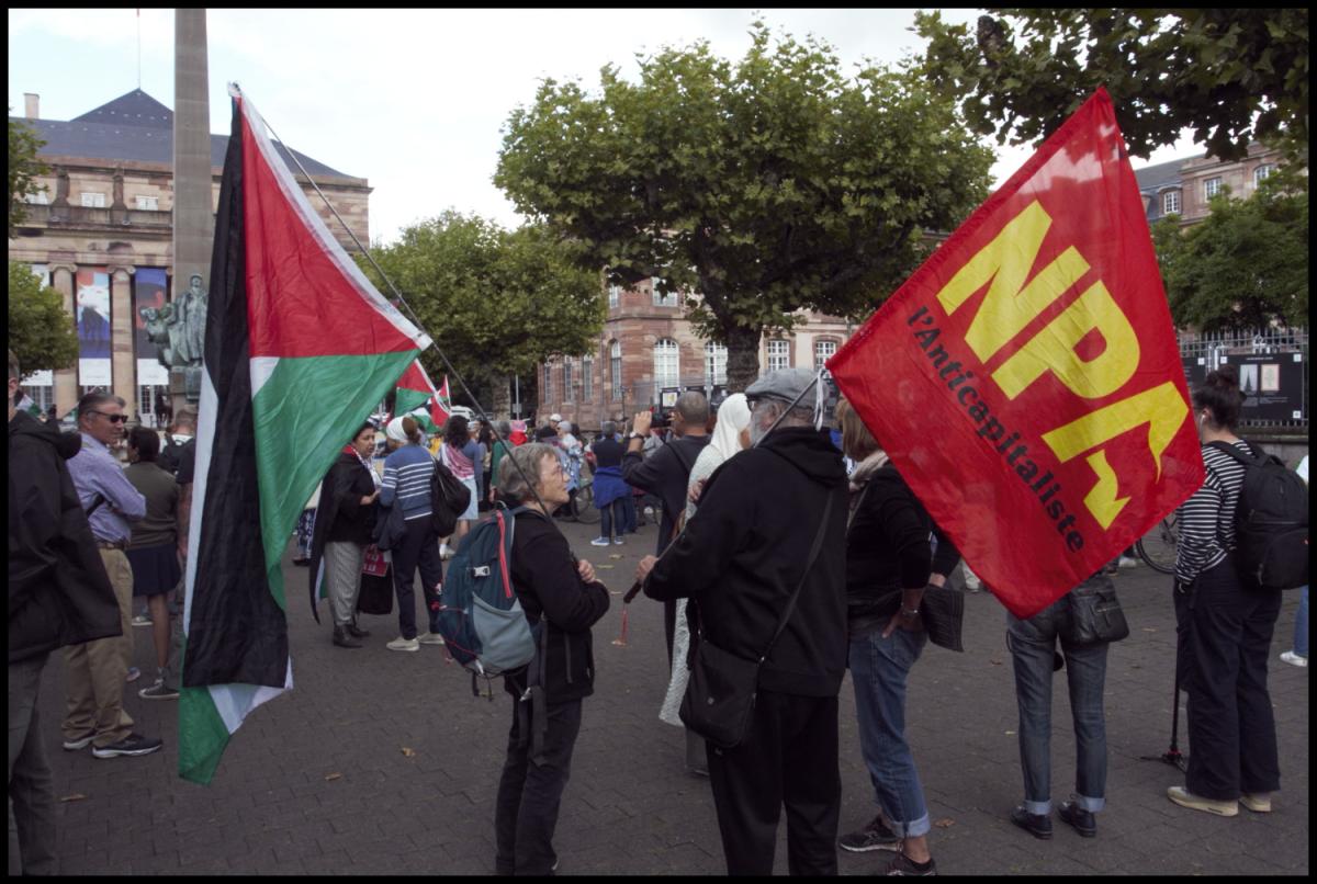 France, Strasbourg, 02-08-2025:les drapeaux de la Palestine et du NPA déployés.