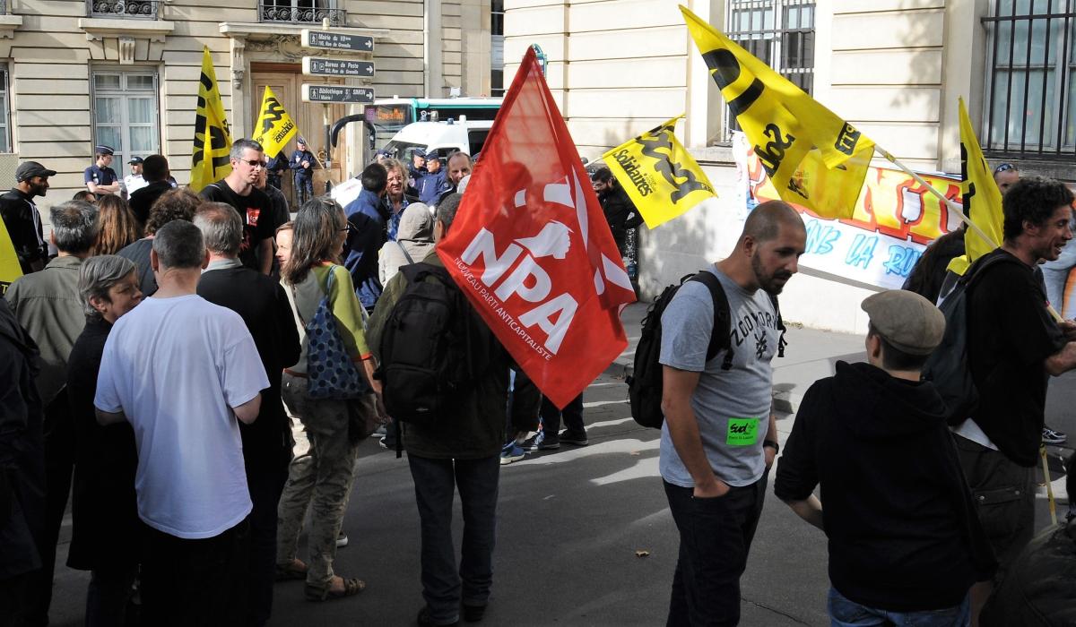 Drapeaux Npa au rassemblement de soutien à Gaël Quirante Ministère du Travail rue de Varenne Paris