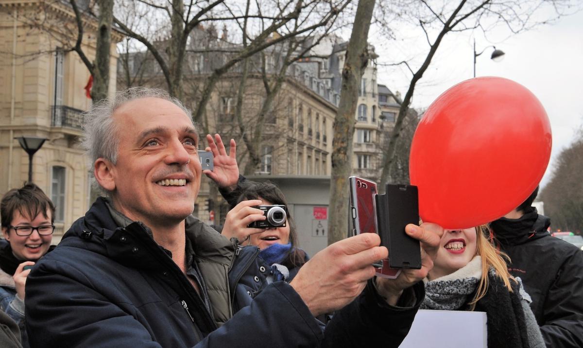 Conférence de presse Philippe Poutou devant le siège de l'Association des Maires de France ballons auquel sont attachés figurine et message de P Poutou autant de ballons que de parrainages à obtenir