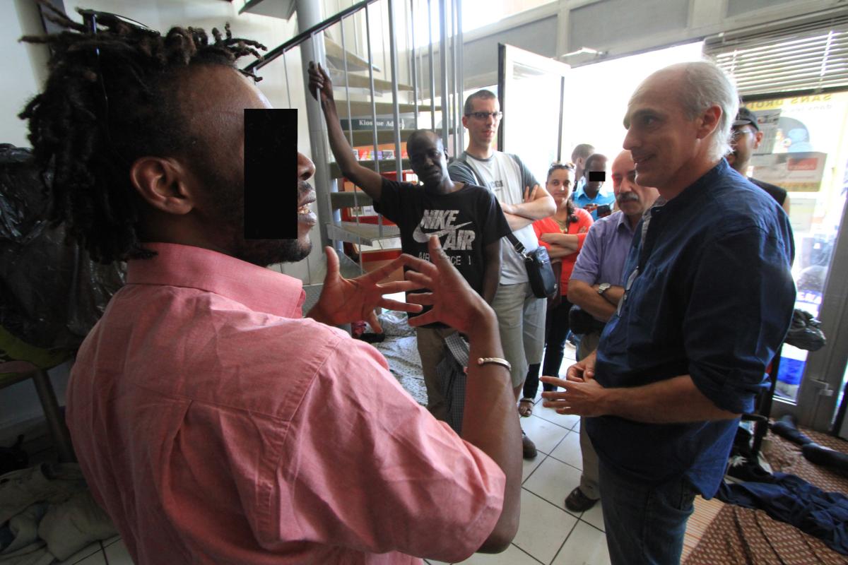 Brétigny-le-Bretonneux, le 3 juillet 2015, Philippe Poutou vient apporter le soutien du NPA aux intérimaires en lutte pour leur régularisation. Ils occupent l'agence ADECCO depuis le 10 juin 2015.